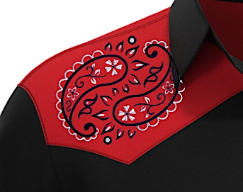 Black body with a red bandana print on the front yoke for a standout look. Traditional cowboy shirt with pointed yokes both front and back, providing that authentic Western silhouette. The embroidered red bandana print brings a pop of color and character to the shirt. Personalize it further by adding your logo, cattle brand, ranch name, or horse imagery, making it a true reflection of your identity.