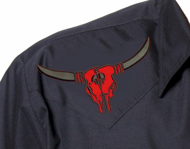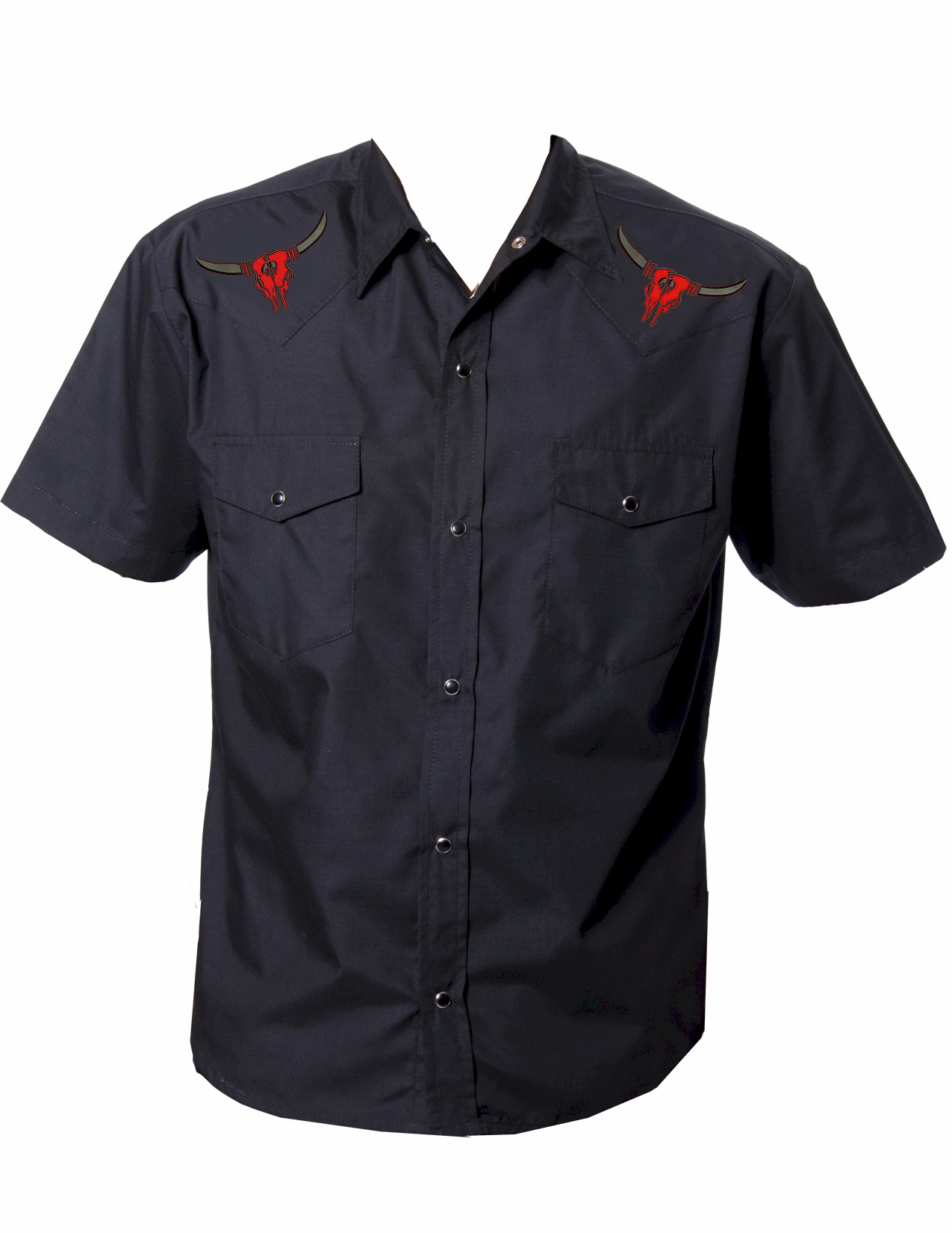 This retro short-sleeve western shirt features an embroidered steer design on the front yokes.