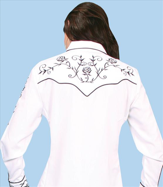 Rose Pearl Snap Western Shirt From Scully - This gorgeous shirt features rose and vine embroidery on the front and back yokes, sleeves and collar tips. Pearl snaps, smile pockets and accent piping complete the look.
