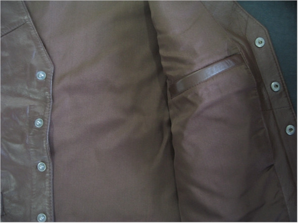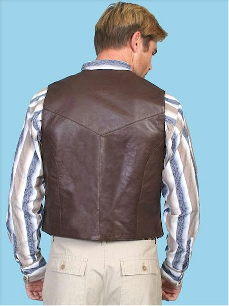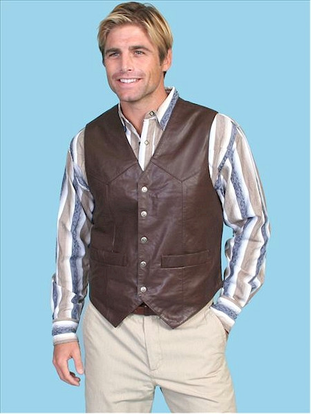 This soft touch brown leather vest is made from handcrafted lambskin and features a solid leather back, single point front and back yokes, and five snaps on the front.