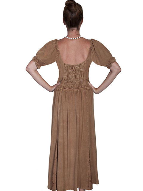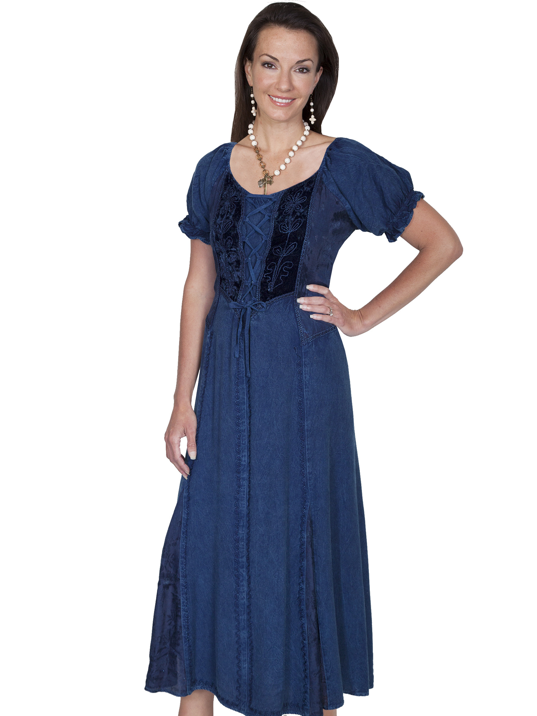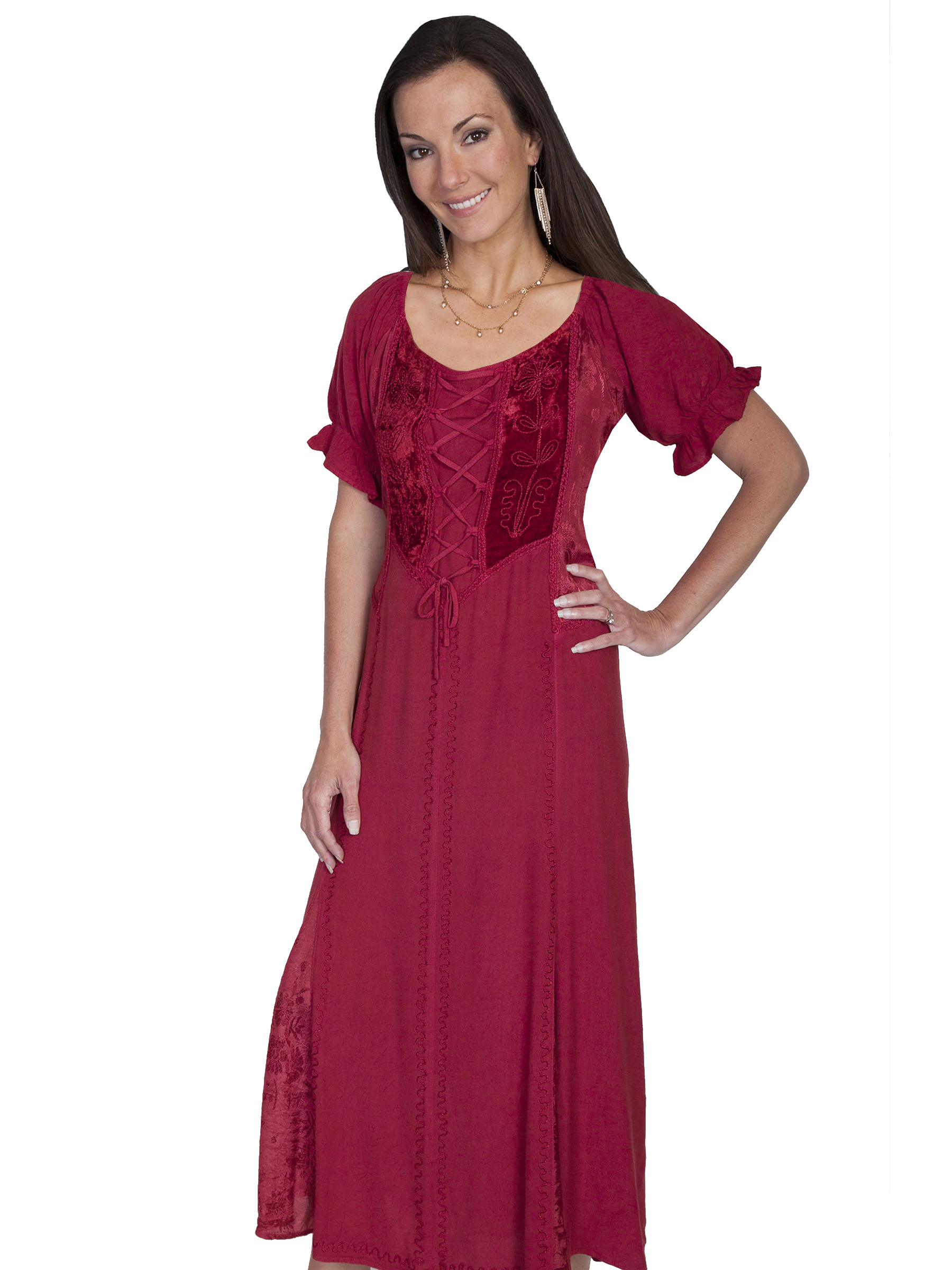 A pretty dress with a gathered sleeve with ruffle, a velvet lace-up front and a flowing skirt with a tonal topstitch.